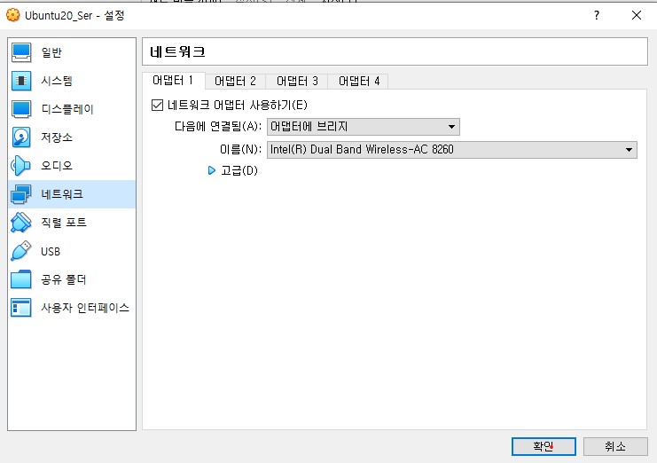좌측 네트워크 메뉴 선택 후, 어댑터 1 탭에서