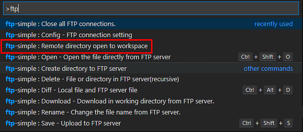 F1키를 눌러 이번에는 ftp-simple : Remote directory open to workspace를 클릭하여 줍니다.